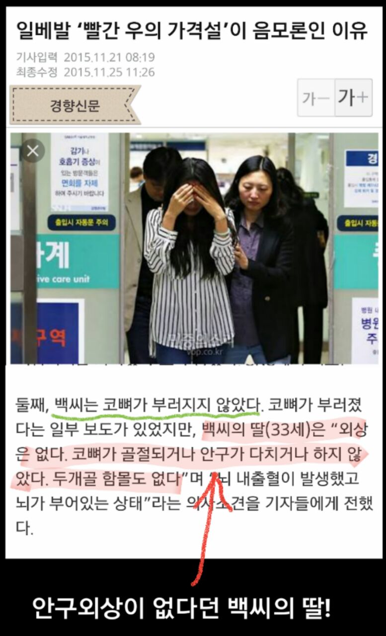 [http://www.nocutnews.co.kr/news/4504337 15일자 뉴스에도 골절을 이야기하고있고] [http://m.media.daum.net/m/media/society/newsview/20161009050103422 보험청구코드에도 (양방)열린 두개내 상처가 있는 외상성 경막하출혈(AS0651)]이 있으니. | [http://www.nocutnews.co.kr/news/4504337 15일자 뉴스에도 골절을 이야기하고있고] [http://m.media.daum.net/m/media/society/newsview/20161009050103422 보험청구코드에도 (양방)열린 두개내 상처가 있는 외상성 경막하출혈(AS0651)] 이 있으니. | ||