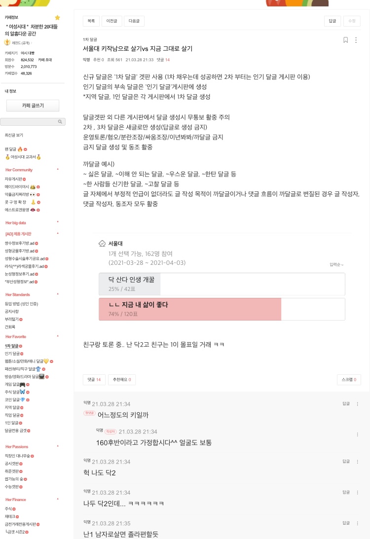 나뮈병들의 구역질나는 PC 감수성을 제외하면 여자는 35세부터 결혼 상대로서 감가상각이 시작되지만 남자는 19~44세까지는 결혼 상대로서 감가상각이 아예 없고, 45~69세까지도 거의 없다. 실제로 한국의 20~30대 여자들은 키 187cm에 비율 좋은 60살의 콜린 퍼스를 엄청 좋아한다.2019.4.11A 댓글12345 2019.4.11B 댓글12 2019.5.25 댓글1댓글22019.6.6 댓글1댓글2댓글3