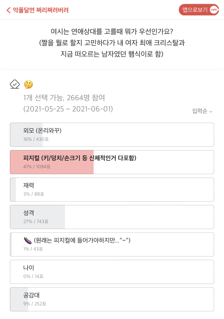 [https://archive.fo/dkYwA 피지컬 VS 얼굴 투표 결과 71.8%(1094표) : 28.2%(430표)로 집계되어 '''피지컬이 2.54배의 대승을 거두었다.'''] | [https://archive.fo/dkYwA 피지컬 VS 얼굴 투표 결과 71.8%(1094표) : 28.2%(430표)로 집계되어 '''피지컬이 2.54배의 대승을 거두었다.'''] | ||