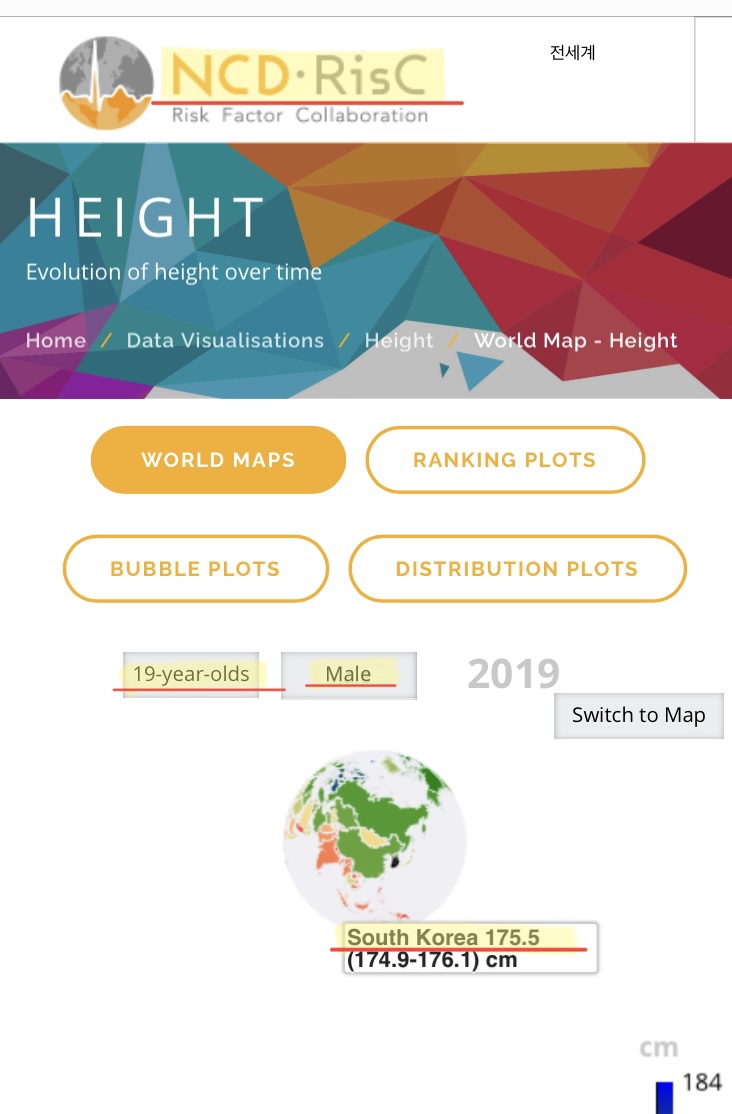 ==전세계 19세 평균키 (NDC-RisC 출처)== | ==전세계 19세 평균키 (NDC-RisC 출처)== | ||