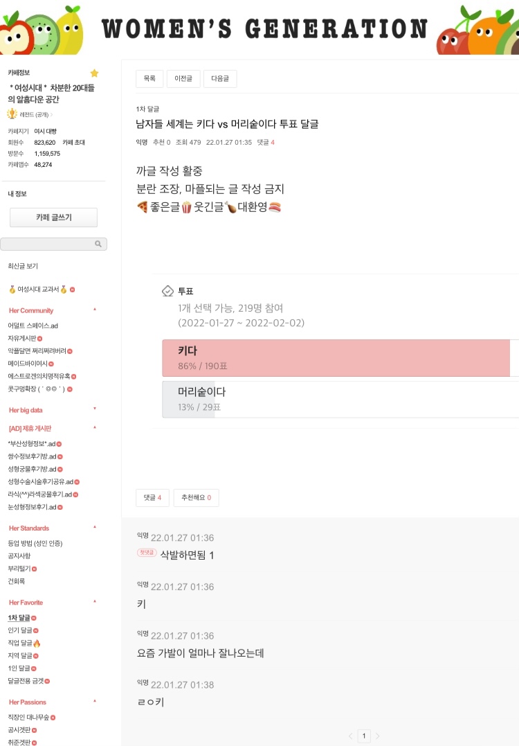 키작남 테라포밍 안당한 사이트는 얼굴까고 민증인증 요구하는 여시밖에 없고(여기도 몇몇은 아이디 사서 오는데 대부분 밴 먹는다.) 그나마 쭉빵이 준회원방 이외에 다른 게시판 열람하려면 여자아이디 + 글 100개, 댓글 100개, 방문일수 33일(당연히 게시글수 채우기용으로 성의 없이 글 적으면 영구 탈퇴)을 채워야해서 테라포밍하러 들어온 난쟁이들의 상당수가 떨어져나갔다. | 키작남 테라포밍 안당한 사이트는 얼굴까고 민증인증 요구하는 여시밖에 없고(여기도 몇몇은 아이디 사서 오는데 대부분 밴 먹는다.) 그나마 쭉빵이 준회원방 이외에 다른 게시판 열람하려면 여자아이디 + 글 100개, 댓글 100개, 방문일수 33일(당연히 게시글수 채우기용으로 성의 없이 글 적으면 영구 탈퇴)을 채워야해서 테라포밍하러 들어온 난쟁이들의 상당수가 떨어져나갔다. | ||