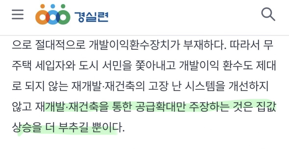 재건축 초과이익 환수제와 재건축-재개발 개발이익 환수제가 없이니 건설사와 돈 많은 집주인은 재건축-재개발로 엄청난 떼돈을 벌고 재건축 분담금을 낼 돈이 없는 기존 원주민과 상가와 세입자들은 [https://archive.md/gLFdp 자기가 살던 집에서 강제로 쫒겨나는 비극이 벌어진다.] (1970년대 [[난장이가 쏘아올린 작은 공]]에서 고발한 현실이 2020년대에도 벌어지고 있다.) | |||