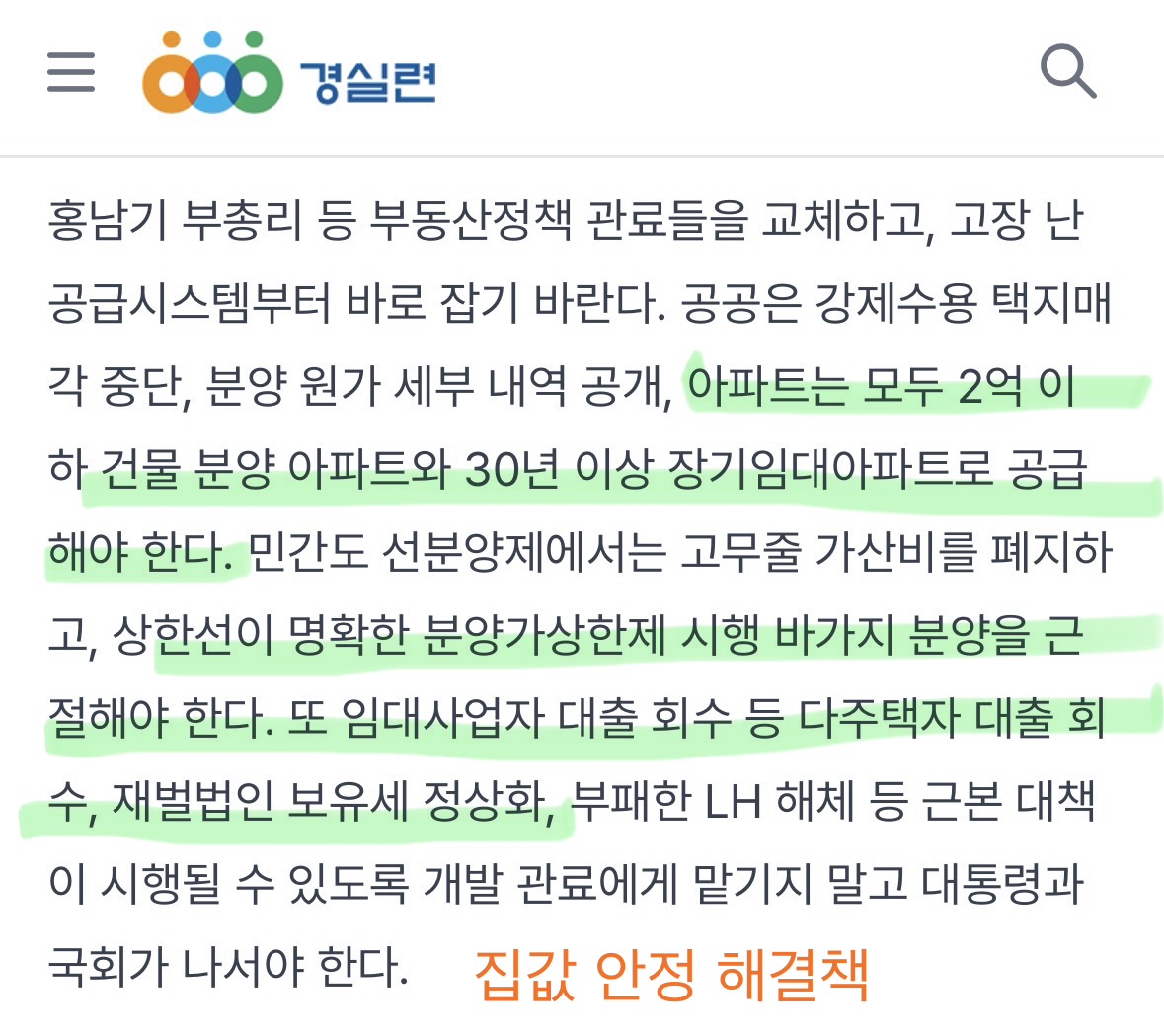 === 집값 정책 짜는 정치인들부터 모범을 보여야함 === | |||