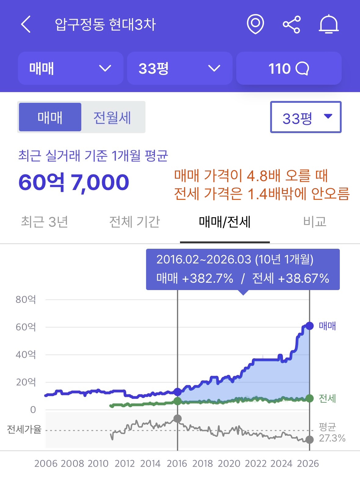 당장 호갱노노 들어가서 2016년~2026년 동안 압구정 현대아파트와 도곡렉슬 매매가격과 전세가격 그래프 비교해보면 매매가격이 폭등할 때 전세가격은 크게 안오르는 것을 알 수 있다.