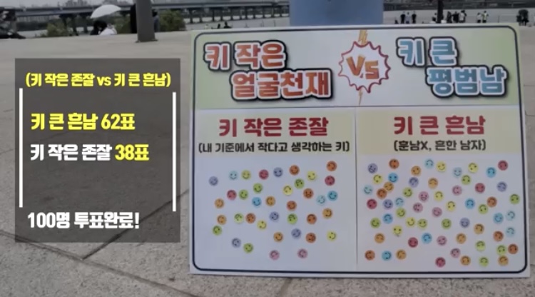 투표 결과 64.7% : 35.3%로 집계되어 키 187 존못남이 키 170 존잘남에게 1.83배 의 대승을 거두었다.