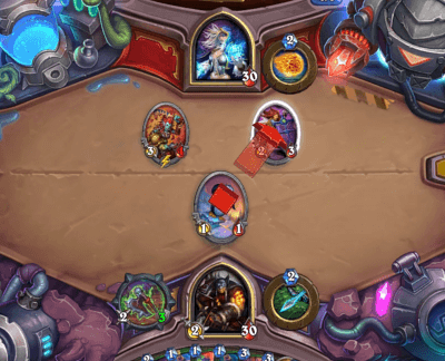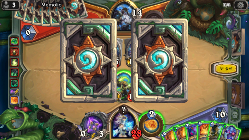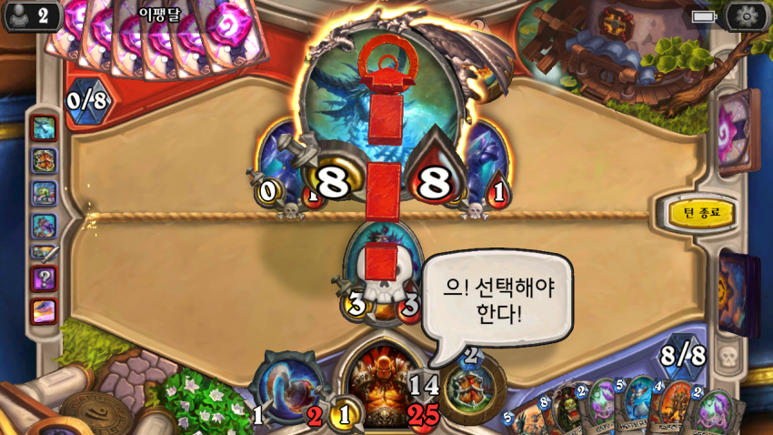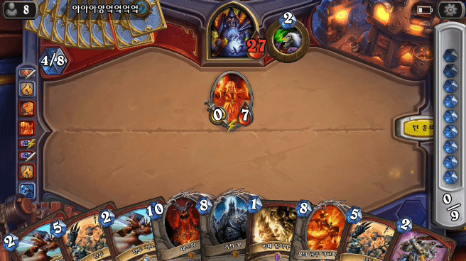 ㄴ 사실 저 경우(켈그켈그켈) 오른쪽에서 딱딱딱 하수인이 맞춰서 안나오는이상 지는경우도 꽤 있다. 켈그켈그켈했는데 기습 냉혈같이 주문만 오른쪽에서 쳐 붙거나 해골마해골마 이렇게 고코스트가 붙거나 하면 손패가 말라서 지는그림이 꽤나 나온다. 하지만 적절하게 하수인이 계속 붙는다면..? 그냥 씨발 서렌안치고 계속 겜하는게 의미가 없을정도다