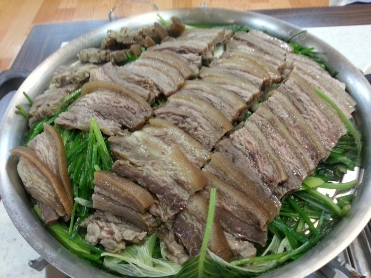 위의 사진은 수육이다. 개고기는 비린내 씹오지기 때문에 구워 먹는 게 불가능해서 보신탕으로 끓여먹거나 수육으로 먹을 수밖에 없다. 조선시대엔 썰지 않고 개 다리채로 상차림에 내놓는 수육을 많이 먹었다.