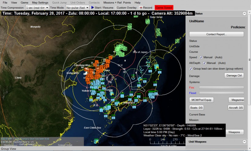 일반적인 민수용 워게임들이 대부분 턴방식을 구현하는 것과 달리 CMANO는 실시간을 채택하고 있으며[1], 플레이어가 보유한 병력 조차도 제대로 알아보기가 힘들다.