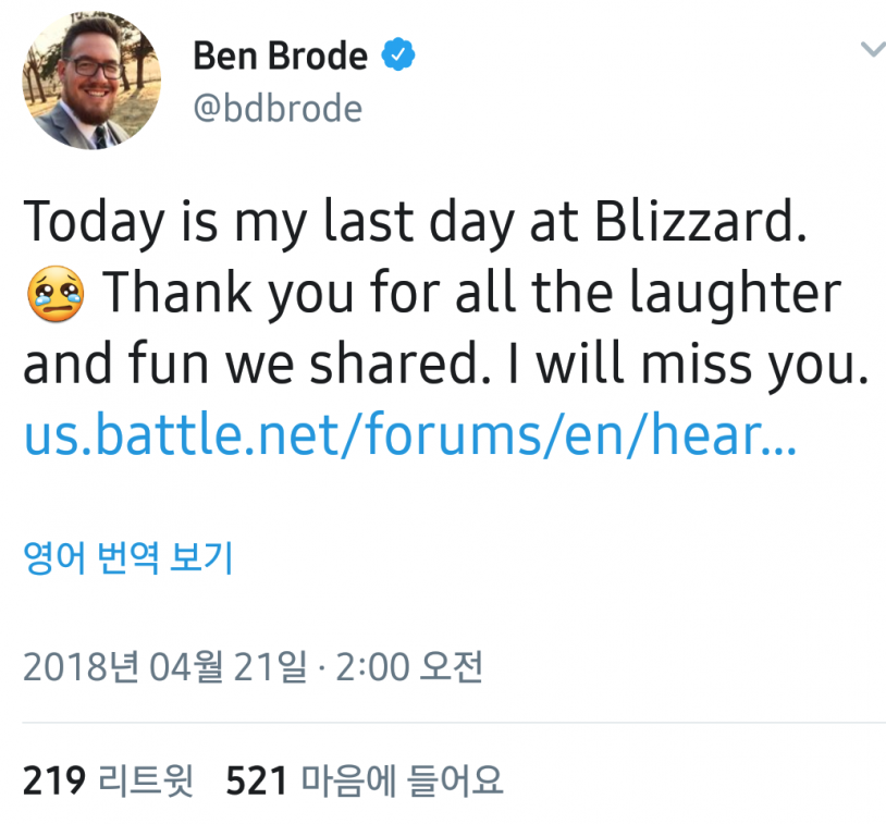 뜬금없이 트위터에 블리자드를 퇴사한다는 글을 올렸다. 다른회사 가서 새 게임 개발할거란다