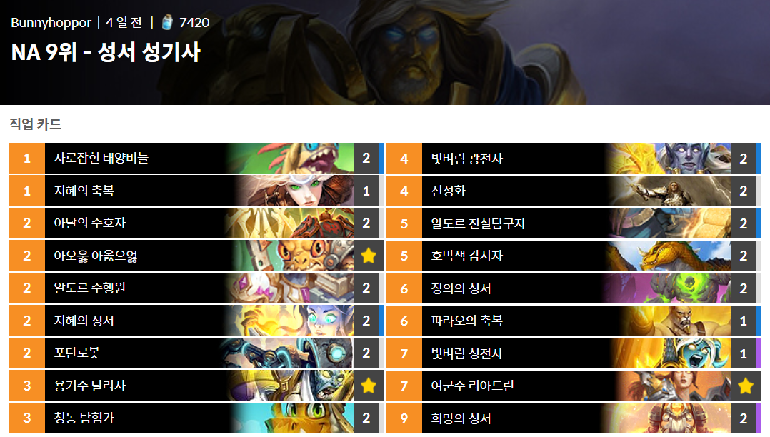 성기사는 진짜 사라질 위험에 쳐해있는 유일한 직업입니다. 신격 성기사는 도적이 많아서 약한 덱이고, 유저들은 아직도 저희가 4티어로 평가한 하이렌더 성기사 주변에 모여있네요. 순혈 성기사는 순혈 재앙 그 자체입니다. |