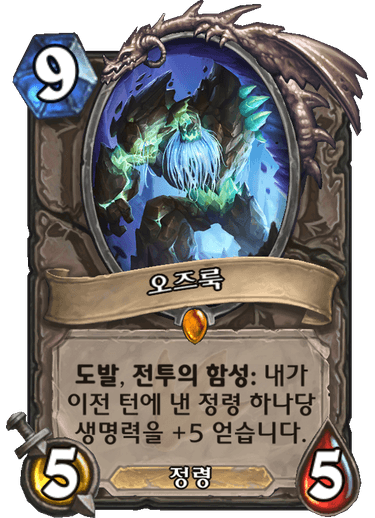 9코 5/5, 정령, 도발, 전투의 함성: 내가 이전 턴에 낸 정령 하나당 생명력을 +5 얻습니다.