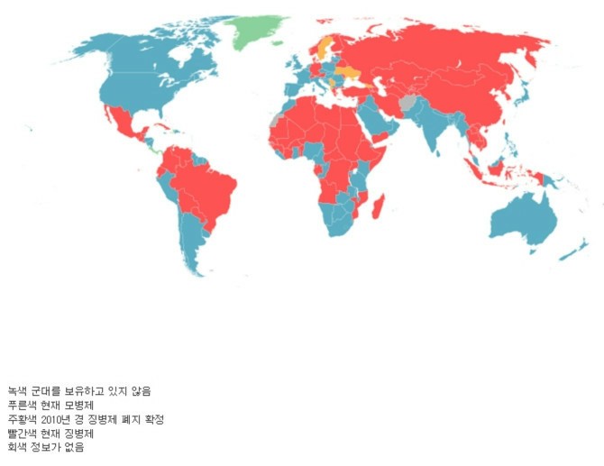노란색 국가는 모병제 전환 예정인 국가 이다. 그렇다고 무조건 모병제로 바뀌는 게 확정은 아니고 결국 예정일 뿐이다.