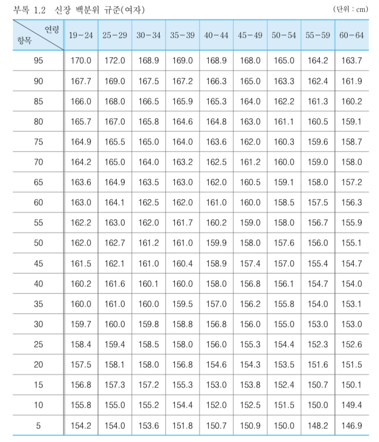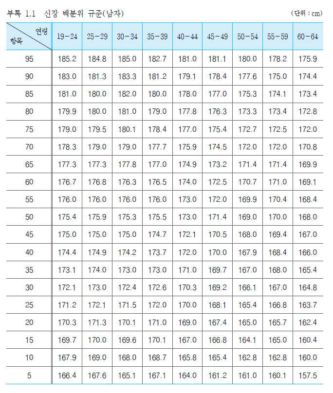 한국 남자 19~24세 키 1cm당 백분위 목록