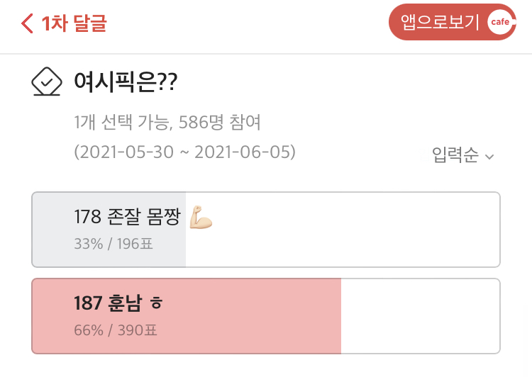 투표 결과 64.7% : 35.3%로 집계되어 키 187cm 존못남이 키 170cm 존잘남에게 1.83배 격차로 이겼다.댓글1 2021.8.302345678A8B댓글1 2021.10.3023456789101112131415161718