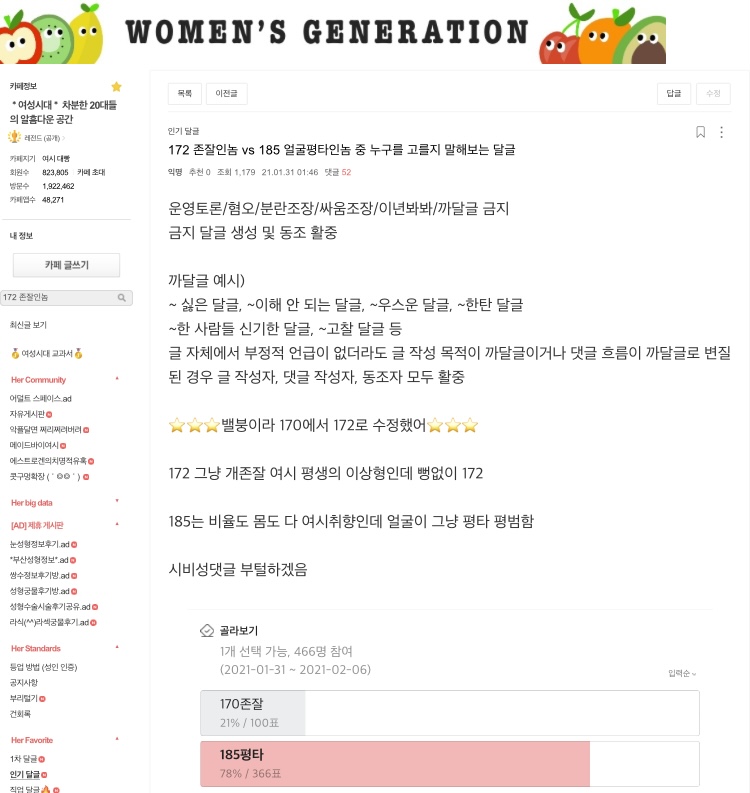 키작남 테라포밍 안당한 사이트는 얼굴까고 민증인증 요구하는 여시밖에 없고(여기도 몇몇은 아이디 사서 오는데 대부분 밴 먹는다.) 그나마 쭉빵이 준회원방 이외에 다른 게시판 열람하려면 여자아이디 + 글 100개, 댓글 100개, 방문일수 33일(당연히 게시글수 채우기용으로 성의 없이 글 적으면 영구 탈퇴)을 채워야해서 테라포밍하러 들어온 난쟁이들의 상당수가 떨어져나갔다.