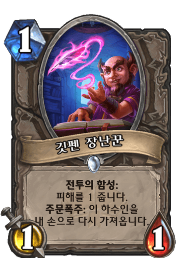 1코 1/1, 전투의 함성:피해를 1 줍니다. 주문폭주:이 하수인을 내 손으로 다시 가져옵니다.