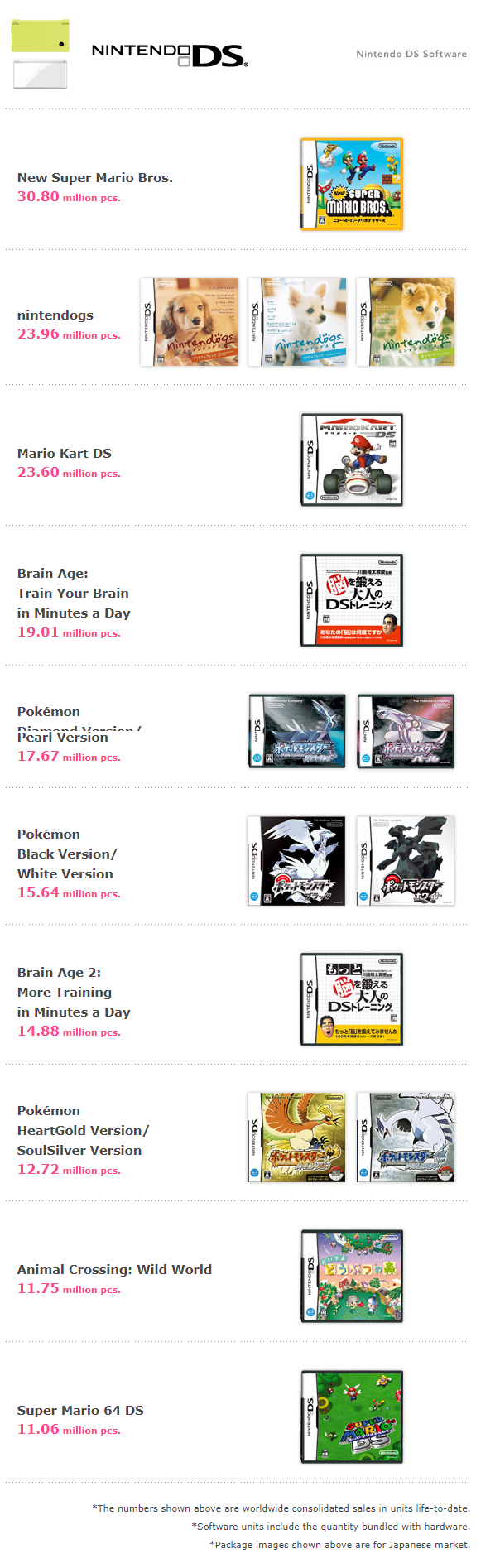 전부 닌텐도 퍼스트 파티 타이틀 + 마리오랑 포켓몬스터가 다해처먹는다. 참고로 Diamond Version/Pearl Version = DP 디아루가/DP 펄기아다.