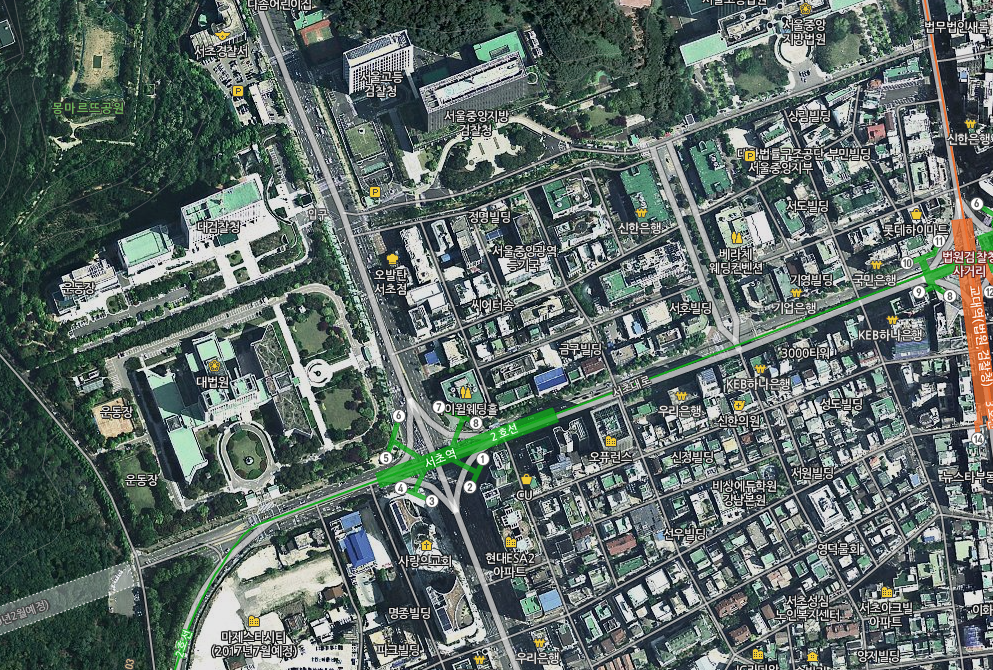 을지로순환선 시청 · 을지로입구 · 을지로3가 · 을지로4가 · 동대문역사문화공원 · 신당 · 상왕십리 · 왕십리 · 한양대 · 뚝섬 · 성수 · 건대입구 · 구의 · 강변 · 잠실나루 · 잠실 · 잠실새내 · 종합운동장 · 삼성 · 선릉 · 역삼 · 강남 · 교대 · 서초 · 방배 · 사당 · 낙성대 · 서울대입구 · 봉천 · 신림 · 신대방 · 구로디지털단지 · 대림 · 신도림 · 문래 · 영등포구청 · 당산 · 합정 · 홍대입구 · 신촌 · 이대 · 아현 · 충정로 · 시청
