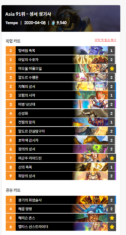 반면 야생전에서는 또다른 성기사 1코 하수인인 정의로운 수호자도 있고, 1뎀 하수인을 확정적으로 뽑는 수정학이라는 카드도 있어서 잘 돌아간다.