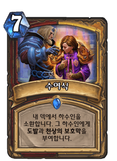 7코, 내 덱에서 하수인을 소환합니다. 그 하수인에게 도발과 천상의 보호막을 부여합니다.