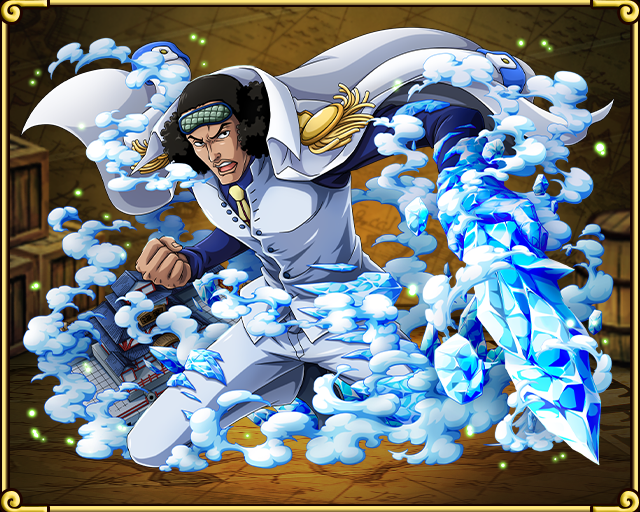 그러나 삼대장임이 밝혀짐과 동시 씹넘사벽의 얼음능력을 써서 밀짚모자 해적단을 당황 타게 만들었다. 최약체급 칠무해+번개 물로켓 잡았다고 좋아죽는 주력 3인방을 30초컷으로 떡발라버린 사건 이후로 밀짚모자 일당은 해군대장을 존나 무서워하게 되었다.
