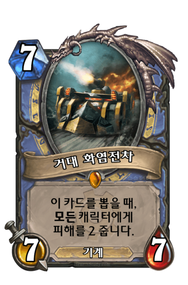 고대놈 법사전설 7코스트 7/7 기계, 이 카드를 뽑을 때, 모든 캐릭터에게 피해를 2 줍니다.