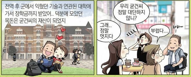 군대에서 배운기술로 대학 쳐 갔다는데 현실은 대학입학하고 1~2년 다니다 군대로 끌려가는 경우가 제일 대부분이고 저 논리대로면 대부분의 군필자 남성들은 대학 진학에 장학금까지 받을 수 있는 스펙이 갖춰져있다는 개병신논리다.