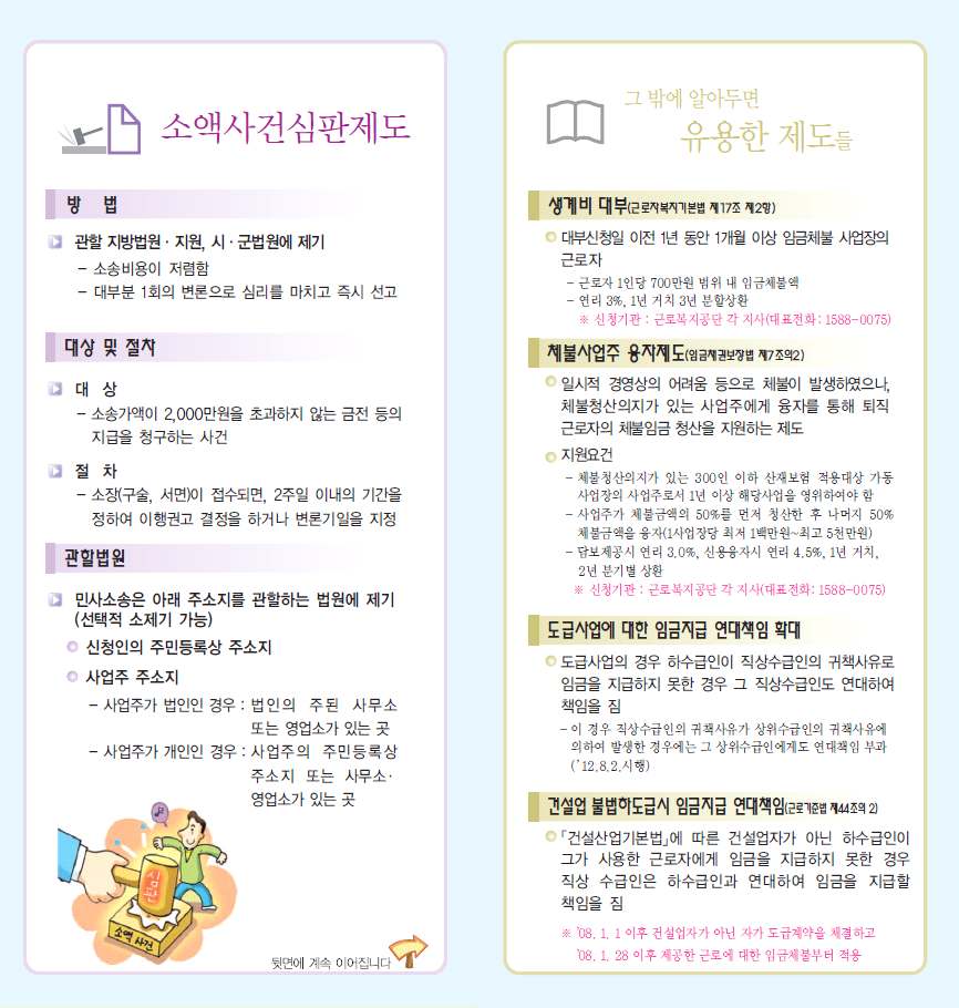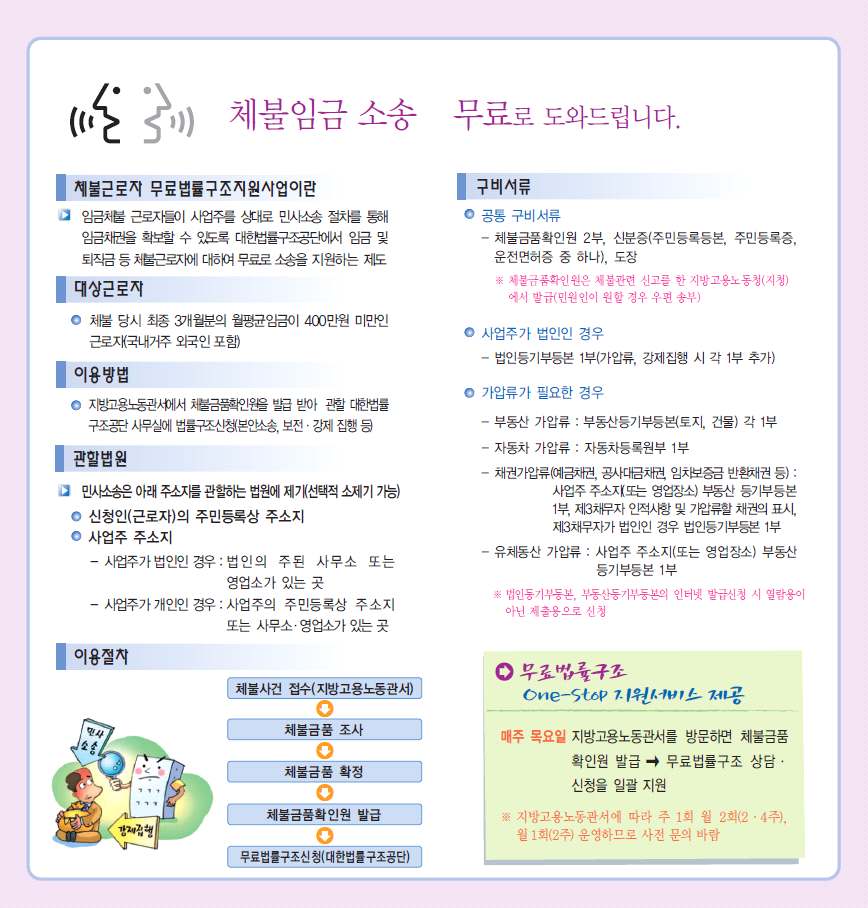 임금체불, 구두된 금액보다 적게 지급, 무급근로요구, 추가수당 미지급 등의 각종 부당처우 사유가 발생하면 피해자가 진정서, 고소장을 제출하여 근로감독관 입회 하에 사건을 처리한다. 사장놈이 돈 먹튀한다고 노동부에 찌르면 찔림당하는 곳이다.