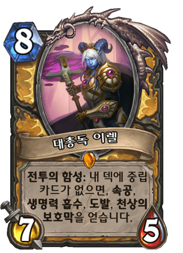 8코 7/5, 전투의 함성:내 덱에 중립 카드가 없으면, 속공, 생명력 흡수, 도발, 천상의 보호막을 얻습니다.