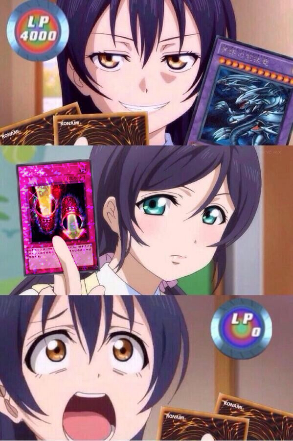 1컷 우미가 들고 있는 카드 : 궁극의 푸른 눈의 백룡. 공격력 4500, 방어력 3800. 소환조건 존나 까다로운 각성울레급 카드. 피통 4000인 노조미가 맞으면 1방. 그래서 우미가 궁푸를 뽑으면서 이 게임 끝났다고 썩소를 짓고 있는 것이다.