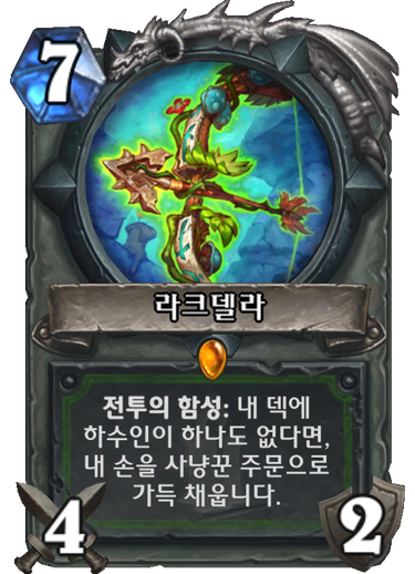 게다가 7코에 이게 칼같이 들어올리가 없다. 드로우 제압기 전부 씹쓰레기인 냥꾼한테 저기까지 하수인 없이 버티는것은 기적에 가깝고 이걸 발동해도 야수를 채워주는게 아니라 쓰쓰쓰같은 주문을 채워준다. 주문에 코스트 감소가 있는 것도 아니다. 8코 이후로 알아서 쓰세요 하고 툭 던지는거다. 거기다가 0코짜리 냥꾼 주문은 없으니 니가 7코에 기적적으로 칼같이 썼다면 동전이 없는 한 다음 턴에 드로우할 카드는 무조건 탄다. 엌ㅋㅋㅋㅋㅋㅋㅋ