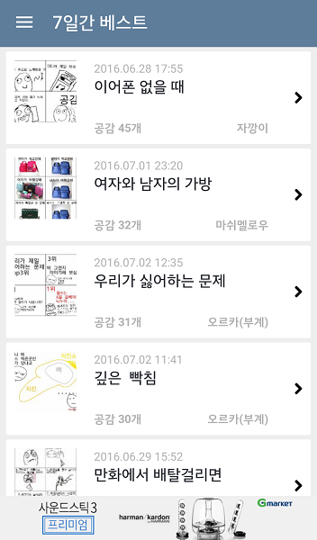 그냥 7일간 공감을 가장 많이 받은 만화가 올라온다. 그런데 보통 좆목러들이 자기 만화 공감 눌러달라고 해서 올라오는 경우가 많다. .참고로 저 공감수 예전에는 200개가 넘었지만 지금은 45개로 존나 떨어진거다