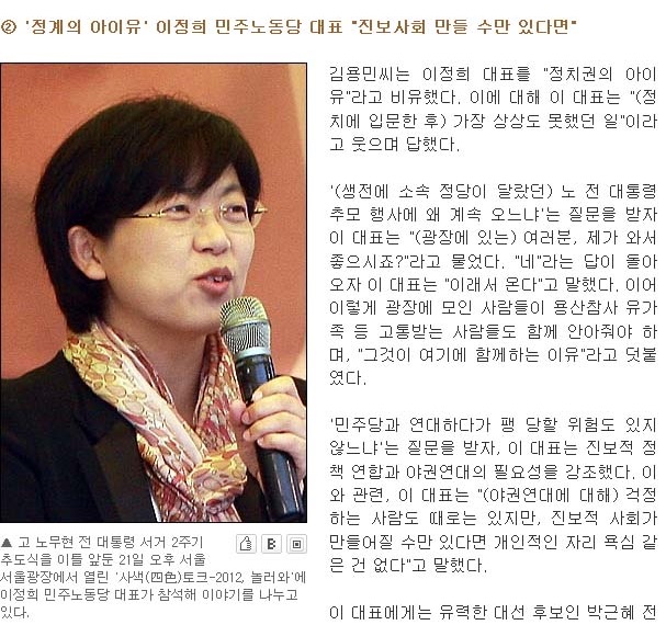 사실 얘는 진보 정치인 중에서도 극좌여서 애초에 민주당에서도 받아주기 힘들다. 그나마 이명박 박근혜 때 같은 보수 정권에서나 정권 찌르는 칼로 사람들이 우와우와 해준 거지, 진보 정권인 지금 봐라. 이정희를 원하는 대중이 있나.