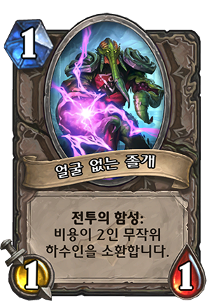 - 잔.악.무.도. 토템 - 술사 하수인, 2코 0/2 토템, 내 턴이 끝날 때, 무작위 졸개를 내 손으로 가져옵니다.