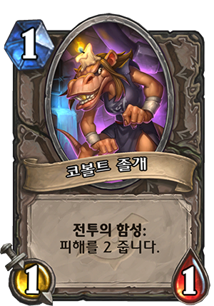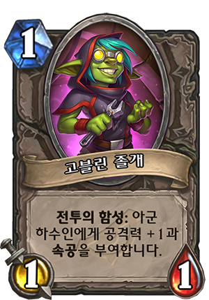 여러분께 졸개를 소개합니다! 졸개를 손에 추가해 주는 ‘잔.악.무.도. 카드’로 만들 수 있으며, 1/1 하수인입니다. 다른 능력치는 없지만, 전장에 놀랄 만큼 강한 타격을 줍니다. |