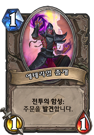 - 사기 증진 - 전사 주문, 1코, 하수인에게 피해를 1 줍니다. 그 하수인이 생존하면, 무작위 졸개를 내 손으로 가져옵니다.