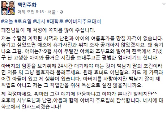 아버지가 죽기 직전 시댁인 발리에 간 상태라서 아버지의 임종을 지키지 못했는데 이를 듣보 블로그 하나가 좋다고 물어서 아버지는 죽어가는데 딸내미는 발리가서 해수욕이나 하고 식으로 썼다가 얻어맞았다. 이걸 또 만화로 그리다 고소미 쳐먹은 윤읍읍은 덤.