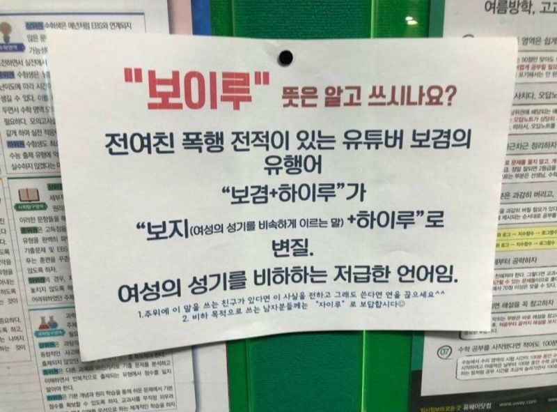 팡주팡역시의 어떤 중학교에서 '보이루는 여혐 단어로 변질이 됐으니 쓰지 말자'는 대자보를 붙인 페미 꿈나무 여학생이 남급식들에게 폭언과 폭행을 당하는 사건이 일어났다고 한다.