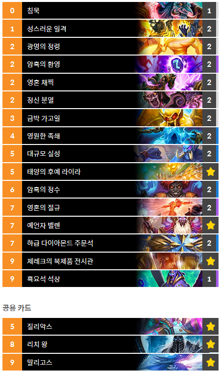 흑마법사와 드루이드를 상대로는 잘 해내는 반면, 어그로 매치업에서는 고통받는 데다가 영혼의 절규 때문에 라자쿠스사제를 상대로 유리했던 강점을 잃어버리고 말았습니다.