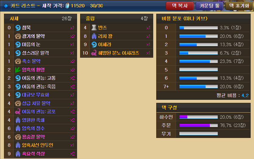 무엇보다 이샤라즈, 리치왕같은 빅 하수인들을 전부 빼고도 잘 굴러가서 덱 가격이 상당히 싸졌다.