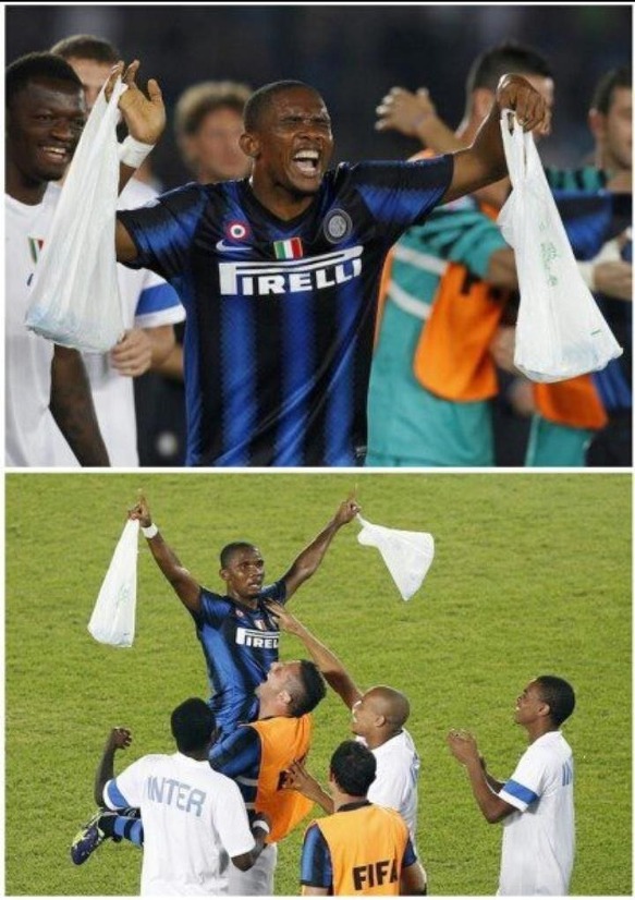 [포토뉴스] 사무엘 에투가 뽕따를 사오자 동료들이 환호하고 있다.