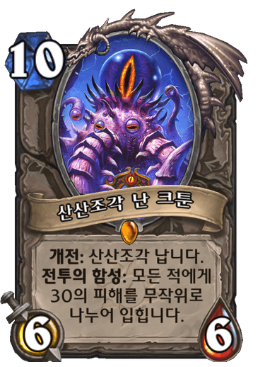 10코 6/6, 개전:산산조각 납니다. 전투의 함성:모든 적에게 30의 피해를 무작위로 나누어 입힙니다.