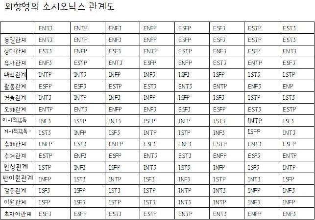 MBTI 유형 간 관계 역동에 관한 내용으로, 사회인격학이나 소시오닉스(socionics) 등으로도 불린다.