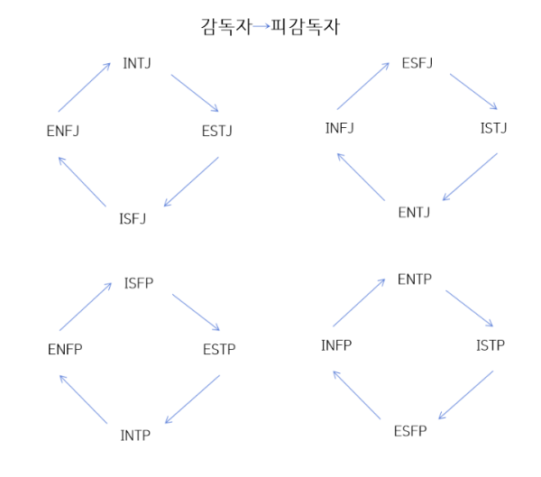 - ↑ 가령 ESTJ의 경우, 주기능 Te를 이용한 문제 해결 및 청사진 제시가 뛰어나나, 부기능이 Si이므로 Te의 활용이 현상을 유지하는 쪽으로 향하며, 이를 뒷받침하는 논리 또한 있는 현실에 기반한다. 이 때, ESTJ의 감독자 INTJ는 Te를 부기능으로서, 주기능 Ni가 통찰하고 조직화한 사고를 현실에 체계화하는 데에 활용하므로, 있는 현실을 넘어 더 합리적이고 체계화된 사고를 도출하는 데에 뛰어난 능력을 보인다. 따라서 있는 현실을 초월한 합리성과 완벽한 논리적 정합성을 통해 안정성에 기반한 ESTJ의 청사진을 뒤엎고 무력화시킬 수 있다. 비슷한 과정으로, INTJ의 감독자 ENFJ는 자기 부기능 Ni가 제공하는 통찰과 비전을 주기능 Fe의 활성화를 위해 사용, 공동체의 공감과 연대를 이끌어 내도록 활용한다. 이 때문에 자기 논리의 현실 적용을 최우선하는 INTJ의 주기능 Ni가 가지는 이기적인 면을 지적하여 무력화할 수 있다.