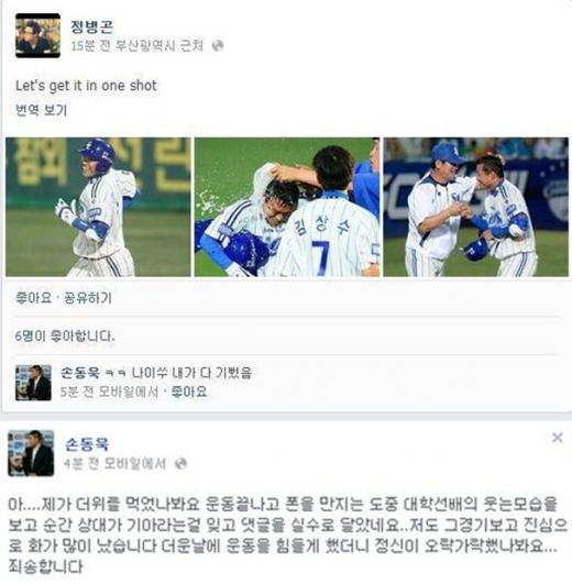 정병곤의 페이스북에 끝내기사진이 올라오자 댓글로 "ㅋㅋ 나이쑤 내가 다 기뻤음"이라고 달았다가 욕을 디지게먹었다.