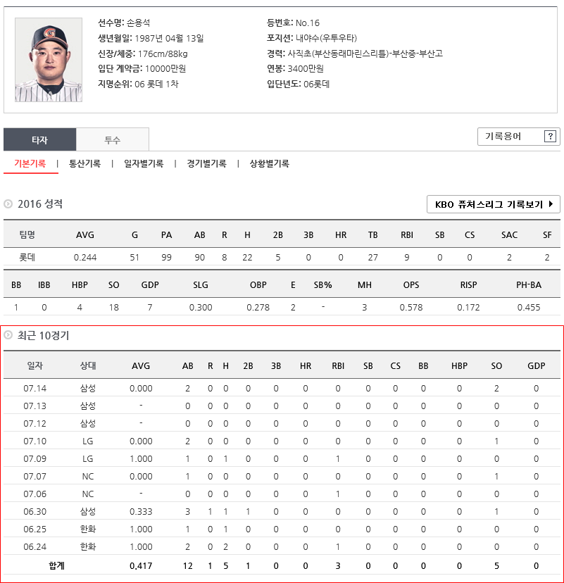 롯데에서 뛰던 시절의 성적. 5할 타율을 기록했다.