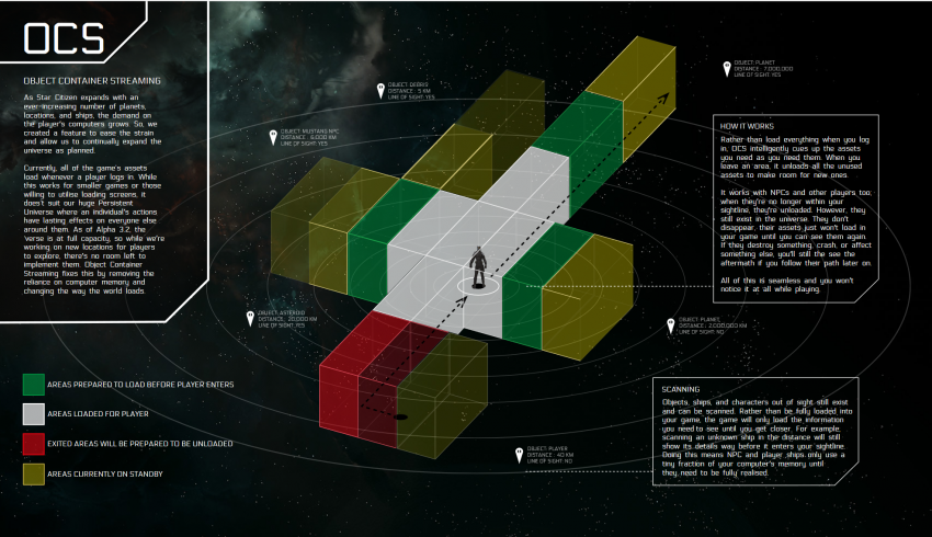 스타시티즌에서 가장 중요한 기술중 하나로 이게 없어서 3.2까지의 스타시티즌은 개적화, 프레임 병신으로 똥겜 취급을 받았다. 스타시티즌던 스타시티즌의 싱글 스쿼드론42이던 이게 없으면 세계를 구현 그 자체를 못하는 갓 기술 크리스 말로는 싱글은 이 기술이 적용되서 기술적 장애물이 모두 없어졌다고 한다. 이 기술 역시 크리스와 CIG(개발사)에서 직접 개발한 기술이다. 풀네임은 오브젝트 컨테이너 스트리밍으로 대단한 킹갓엠페러 최적화 기술일것 같지만 본질은 로딩기술이다. 스타시티즌 개발모토중 하나가 인게임에서 로딩창이 없게 만든다인데 그전까지는 모든 게임요소를 모두 로드하는 방식으로 로딩창이 없게 만들었지만 이 방식은 존나 큰 행성을 구현하거나 인게임 월드를 더 확장 시킬 수 없었다.(이 기술이 없었을땐 크루세이더 행성의 주변 궤도와 위성만이 존재했었다) 여튼 개발진의 설명은 이러하다.
