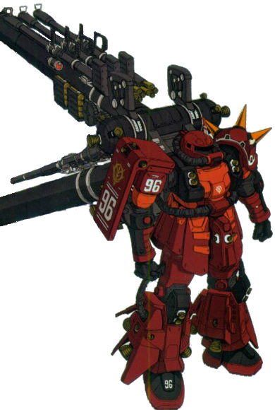 뒤에 딸린 탱크가 본체 자쿠보다 우람하게 커서 배보다 배꼽이 큰 격이 됐다. 반대급부로 이 프로필런트 탱크가 엄청나게 큰 덕분에 기체를 세우기 짱 편하다.