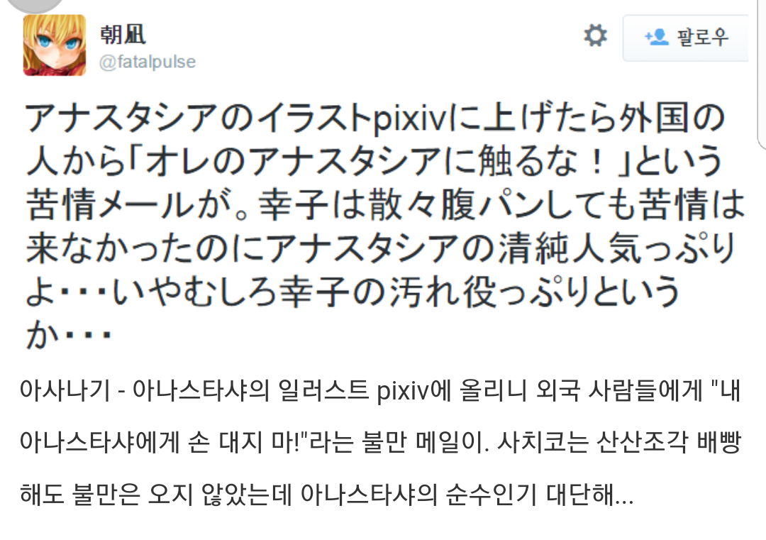 아나스타샤 배빵을 그려서 협박 메세지도 많이 받았다 다만 실제 위에 나온것 처럼 소아성애자 망가만 그래서 싫어하는 사람도 ㅈㄴ많음 특유의 그림체도 있지만