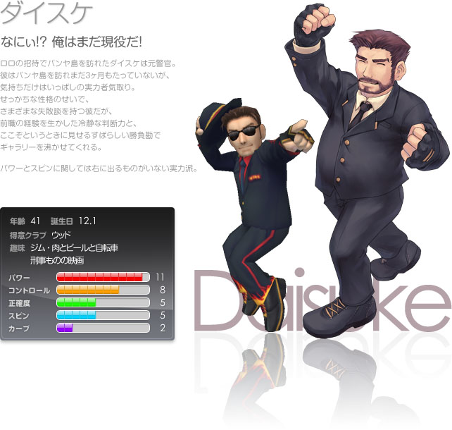 팡야의 등장인물, 나이가 41세로 수천살 산 몇몇 이세계 종족을 제외한 인간 중에서 가장 많고, 생일은 12월 1일. 29세 아래인 로로와 동행한다.